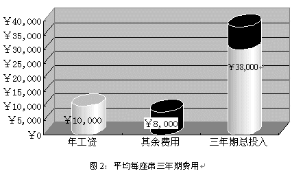 就中國目前的經(jīng)濟水平而言,一個座席人員年收入(包括工資、獎金、福利等等)大約為¥10,000,而每個座席人員所配備的軟硬件設施合計約為¥5,000;據(jù)專業(yè)機構統(tǒng)計,中國的座席人員平均穩(wěn)定的工作年限為三年,而在這三年為了保證座席人員能夠準確、高效的實現(xiàn)對用戶提供專業(yè)服務,所投入的培訓費用大約為¥3,000。所以在三年期間為每個座席的平均花費為¥38,000。