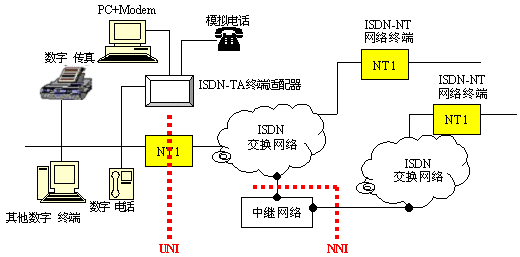 ISDN概念中的業(yè)務(wù)綜合的核心是從用戶端出發(fā),建立了一套標準的用戶和網(wǎng)絡(luò)接口協(xié)議體系(UNI:User-Network Interface)。同時給出了各ISDN網(wǎng)絡(luò)間互聯(lián)的NNI接口。這樣,非常簡單的統(tǒng)一了開發(fā)標準,提供了一個廠商間開放的競爭環(huán)境。見下圖。