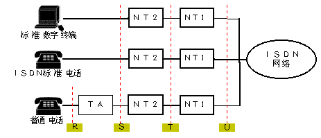 TA:終端適配器,完成非標準設(shè)備到ISDN速率的匹配及協(xié)議轉(zhuǎn)換(它可以在TE2中內(nèi)嵌實現(xiàn));以上各類設(shè)備間的連接接口稱為參考點(見下圖):