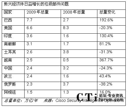 幾個世界經(jīng)濟領先的國家在2008年和2009年間垃圾郵件量有所降低;然而,發(fā)展中國家的垃圾郵件量呈現(xiàn)上升趨勢。
