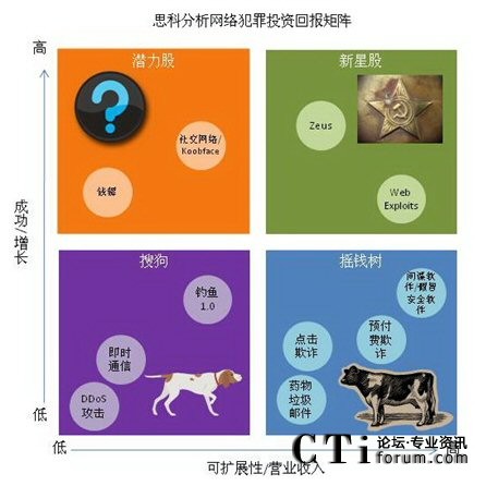 思科網(wǎng)絡犯罪投資回報(CROI)矩陣:今年的《年度安全報告》首次推出了思科CROI矩陣,以波士頓咨詢集團著名的“增長-份額矩陣”為基礎。CROI分析了2010年何種類型的網(wǎng)絡犯罪將為成為“成功者”以及“失敗者”。該矩陣根據(jù)2009年的表現(xiàn),預測大量的銀行業(yè)Trojan