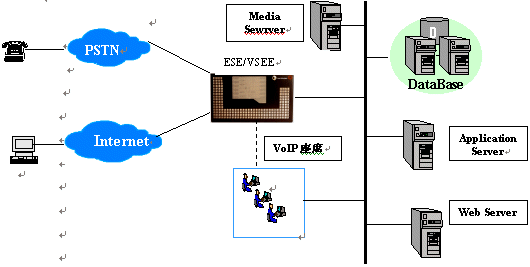 目前, ESE/VSE的主要應(yīng)用在呼叫中心平臺,PHS增值業(yè)務(wù)平臺,如短消息中心,預(yù)付費(fèi)業(yè)務(wù),及其他各種信息處理平臺。