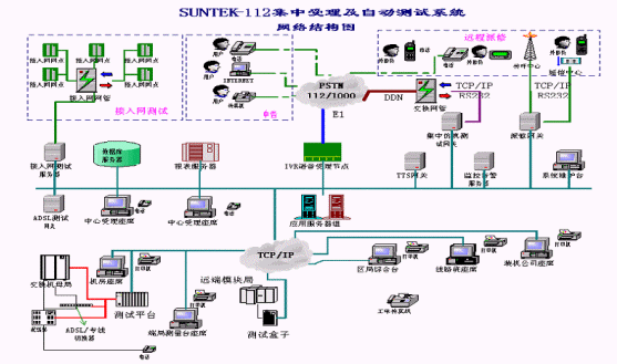 系統(tǒng)在設(shè)計時采用集中受理、分布測量的結(jié)構(gòu)化、模塊化設(shè)計:受理中心進行112的集中受理和業(yè)務(wù)處理,端局完成相應(yīng)用戶線的測試功能,所有測試數(shù)據(jù)等均送至受理中心。系統(tǒng)測試準確、任務(wù)分擔、負荷均衡,處理速度快,性能可靠。系統(tǒng)的受理模塊和測試模塊相互協(xié)調(diào)又各自獨立,使二者可以統(tǒng)一地作為SUNTEKTM-112集中受理及自動測試系統(tǒng),又能各自作為子系統(tǒng)與其它廠家(112系統(tǒng)、97系統(tǒng)、1000號等)的產(chǎn)品結(jié)合起來為112系統(tǒng)服務(wù)。系統(tǒng)網(wǎng)絡(luò)結(jié)構(gòu)圖如下所示: