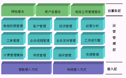 SP統一管理系統從功能邏輯上劃分,我們歸納為三大功能層來對系統進行總體的介紹:接入層、運營管理層、自服務層。如下圖所示: