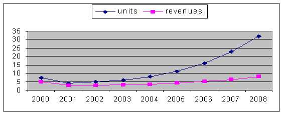 圖2、2000年至2008年全球視頻會議桌面系統(tǒng)市場:數量與收入預測