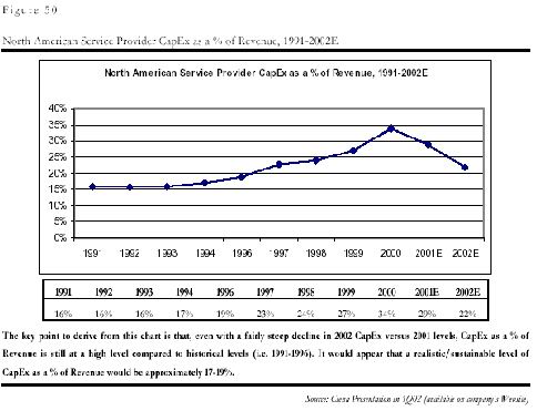 和中國的問題一樣,制造商的問題是電信服務(wù)企業(yè),即運(yùn)營商的投入減少造成的。由于上世紀(jì)末互聯(lián)網(wǎng)和電子商務(wù)泡沫的虛假繁榮的影響,各運(yùn)營商都嚴(yán)重高估了市場需求,認(rèn)為需求是會隨著通信能力的增強(qiáng)無限增加,因此市場規(guī)模是會無限擴(kuò)張的,他們在缺乏對最終用戶需求的深入分析的前提下,普遍在基礎(chǔ)設(shè)施的建設(shè)上進(jìn)行了超大規(guī)模的投入,其基礎(chǔ)設(shè)施建設(shè)投入在收入中的比例一度在2000年從平均的15%達(dá)到了創(chuàng)記錄的35%。