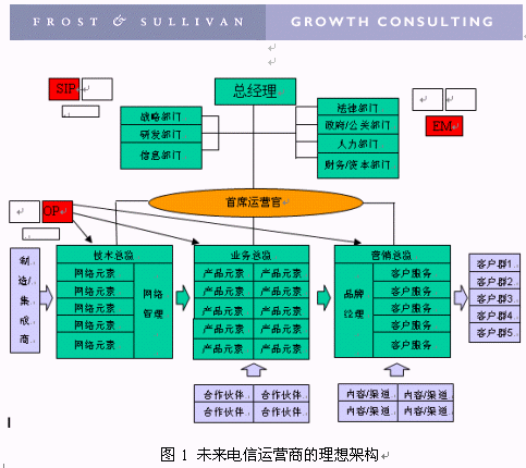 Frost & Sullivan(中國)公司深入研究國際主流運營商的組織結(jié)構(gòu)與管理模式,同時參考了國際上公認的eTOM模型,并結(jié)合國內(nèi)電信運營商組織結(jié)構(gòu)的現(xiàn)狀,提出了圖1所示的未來電信運營商的理想架構(gòu)。理想架構(gòu)的確定對電信運營管理的變革具有重要的意義。只有事先明確了方向,并且對未來達成了廣泛一致的共識,才能對目標(biāo)過程進行分解,有步驟、有方法、有成效的完成目標(biāo)。