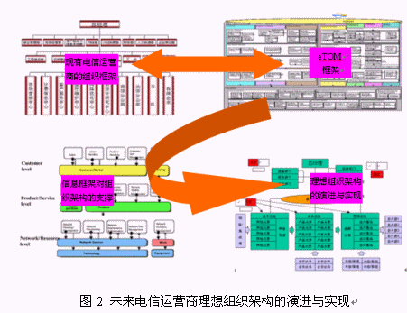 現(xiàn)有的電信運營商的管理架構(gòu)向理想的管理組織架構(gòu)演進過程中,要涉及到不同的中間過程和步驟,對中間過渡狀態(tài)的評估和有效實現(xiàn),是實現(xiàn)演進的關(guān)鍵。現(xiàn)有組織架構(gòu)管理職能的對應(yīng),業(yè)務(wù)流程的標(biāo)準化,管理流程的標(biāo)準化,企業(yè)IT支撐架構(gòu)對業(yè)務(wù)職能部門的支撐,這些環(huán)節(jié)都是運營商應(yīng)該重點考慮的中間內(nèi)容。圖2顯示了未來電信運營商理想組織架構(gòu)的演進與實現(xiàn)過程。其中的任何一個環(huán)節(jié)都是電信運營管理研究的核心課題,也直接影響到了電信運營管理變革的成敗。