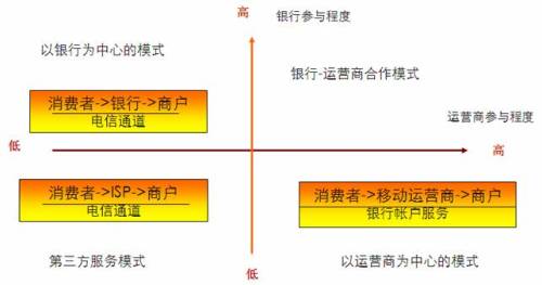 從產(chǎn)業(yè)鏈環(huán)節(jié)上看,移動(dòng)支付的主要參與者主要包括:消費(fèi)者、平臺(tái)提供商、銀行、運(yùn)營(yíng)商和商戶。其中,銀行和運(yùn)營(yíng)商在其中具有較高的談判能力。因此,可以按照這兩者在產(chǎn)業(yè)鏈中的參與程度,劃分移動(dòng)支付的商業(yè)模式?偟膩碚f,銀行機(jī)構(gòu)管理著廣大用戶的資金帳戶,擁有完善的支付體系,在支付領(lǐng)域具有天然的用戶信任。運(yùn)營(yíng)商則擁有完備的網(wǎng)絡(luò)設(shè)施和先進(jìn)的IT系統(tǒng),通過定制終端,運(yùn)營(yíng)商可以將各種先進(jìn)的移動(dòng)應(yīng)用提供給用戶,使用戶獲得良好的移動(dòng)化生活體驗(yàn)。因此,運(yùn)營(yíng)商在這方面具有較好的用戶資源和營(yíng)銷渠道。