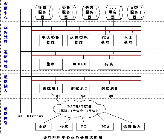 另一種方案是PDA和證券營(yíng)業(yè)部前端機(jī)(實(shí)際就是電話委托前端機(jī))采用FSK通訊方式,使用電話委托的通道來(lái)完成所有的委托查詢。這種方式的速度快,信息容量大,保密性強(qiáng),而且營(yíng)業(yè)部不需單獨(dú)申請(qǐng)電話線路,PDA和電話委托線路可動(dòng)態(tài)分配,使其電話線路得到最大限度的利用。另外,營(yíng)業(yè)部對(duì)外形象也好,只用一個(gè)號(hào)碼就可讓股民完成電話委托、PDA委托等多種委托方式,給股民帶來(lái)了方便。不過(guò)這種方式需要得到電話語(yǔ)音卡提供廠商的產(chǎn)品技術(shù)支持,語(yǔ)音卡必須同時(shí)支持標(biāo)準(zhǔn)的DTMF和FSK的方式,卡上有充足的能力來(lái)處理兩種方式,在語(yǔ)音處理卡的底層驅(qū)動(dòng)應(yīng)該將電話和PDA的委托區(qū)別開(kāi)來(lái),目前市場(chǎng)能夠完全支持這種應(yīng)用的只有深圳市東進(jìn)通訊技術(shù)股份有限公司的產(chǎn)品,東進(jìn)技術(shù)的新一代PCI系列語(yǔ)音卡數(shù)字卡和模擬卡都完全采用DSP(數(shù)字信號(hào)處理器)架構(gòu),卡上有專用DSP來(lái)處理DTMF和FSK的收發(fā),是目前PDA委托前端的最好選擇;這種方案還應(yīng)該得到證券電話委托系統(tǒng)的開(kāi)發(fā)商的支持,在電話委托系統(tǒng)里增加處理PDA委托的功能。目前恒基偉業(yè)的“股靈通”就是采用這種方式。