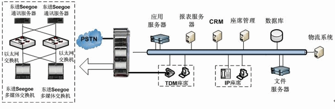 東進(jìn)技術(shù)電視購物呼叫中心解決方案,采用東進(jìn)技術(shù)Seegoe系列多媒體交換機(jī)和多媒體服務(wù)器搭建系統(tǒng)平臺(tái)。東進(jìn)Seegoe系列多媒體交換機(jī),具有豐富的媒體資源和強(qiáng)大的處理能力,并提供功能模塊的N+1全冗余備份,滿足了高負(fù)荷、大并發(fā)和關(guān)鍵業(yè)務(wù)的可靠運(yùn)營。以Seegoe多媒體交換機(jī)、Seegoe通訊服務(wù)器為核心的面向業(yè)務(wù)流程的呼叫中心平臺(tái)在媒體交換層以全新的IP架構(gòu)實(shí)現(xiàn)網(wǎng)絡(luò)融合、應(yīng)用融合和業(yè)務(wù)融合。如下圖所示: