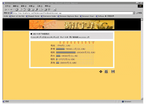 系統(tǒng)提供多級權(quán)限的各種統(tǒng)計,比如:按帳號銷售情況統(tǒng)計、按分類銷售情況統(tǒng)計、按下級單位銷售情況統(tǒng)計等等。統(tǒng)計時可以指定統(tǒng)計的時間段,這些統(tǒng)計信息的結(jié)果以條形圖的形式表現(xiàn)出來,形象生動。(參看圖9)