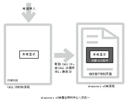 。。Ebanswers CRM整合呼叫中心的這種方式過(guò)程更清晰,當(dāng)有電話呼入系統(tǒng)時(shí),由內(nèi)嵌的OCX控件取到call