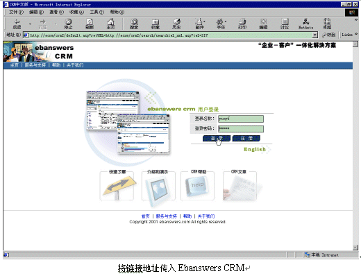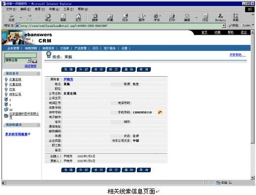Ebanswers CRM系統(tǒng)去激活相關(guān)客戶資料的IE頁(yè)面進(jìn)行處理:如果此號(hào)碼數(shù)據(jù)庫(kù)中存在,則顯示此人的信息,如果不存在,則顯示CRM中添加新線索的頁(yè)面。而Ebanswers