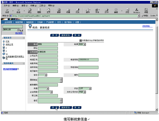 。。比如現(xiàn)在有一個(gè)新客戶黃航的電話13082856110呼入Ebanswers呼叫中心,console控制臺(tái)接收到這個(gè)電話號(hào)碼以后,會(huì)產(chǎn)生一個(gè)URL鏈接地址tel=217,以參數(shù)的形式附在調(diào)用的CRM頁(yè)面http://ecrm/crm2/default.asp?retURL=http://ecrm/crm2/search/searchtel_xml.asp后面,當(dāng)話務(wù)員登錄以后,就會(huì)彈出相應(yīng)的添加新線索頁(yè)面,話務(wù)員填寫好相關(guān)信息后,按下"保存"按鈕就可以建立新線索了。