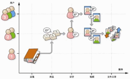 如圖1所示,用戶首先打開(kāi)基于呈現(xiàn)業(yè)務(wù)的地址簿,向其好友發(fā)送一條消息,然后向該好友發(fā)起一個(gè)話音呼叫,在通話過(guò)程中又添加一個(gè)新的對(duì)象,隨后在這個(gè)多方通話中又添加了視頻業(yè)務(wù),接下來(lái)又去除一個(gè)對(duì)象,多方通話恢復(fù)為雙方通話,最后使用了文件共享業(yè)務(wù)。所有這些多媒體業(yè)務(wù)都是由用戶的一個(gè)SIP會(huì)話控制和激活的。