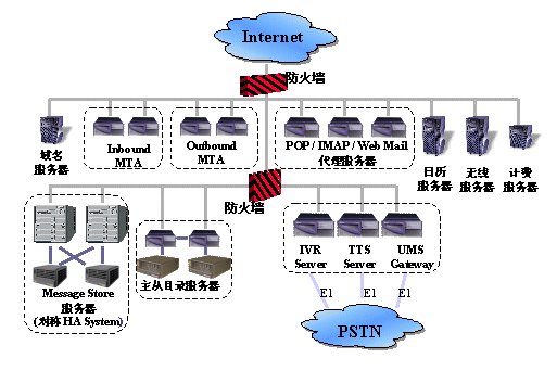 UMS系統(tǒng)的軟件采用Blue-Sillicon公司的UMS軟件,郵件系統(tǒng)為iPlanet Message Server 5.0(iMS 5.0)。Blue-Silicon公司的UMS軟件實現(xiàn)了上面我們所描述的功能,將電話、傳真和郵件和為一體,為用戶提供方便快捷的全方位信息服務。