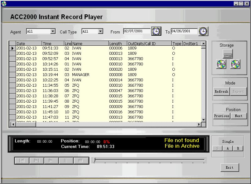 管理員可以通過MMPlayer對錄制的語音進(jìn)行回放,系統(tǒng)提供完善的檢索功能,可以根據(jù)來電時(shí)間、來電號碼、呼入/呼出以及座席等條件靈活地進(jìn)行查詢,很容易地找回所儲(chǔ)存的每個(gè)座席各種事件的詳細(xì)信息,并可以轉(zhuǎn)換成通用的.WAV格式文件在任何PC上進(jìn)行播放,或者通過局域網(wǎng)絡(luò)或互聯(lián)網(wǎng)進(jìn)行分發(fā)。