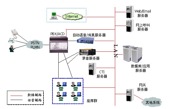 多媒體呼叫中心平臺(tái)包括:排隊(duì)機(jī)(PBX/ACD)、CTI服務(wù)器、WEB服務(wù)器、自動(dòng)語音系統(tǒng)(IVR/VRU)、錄音系統(tǒng)、座席終端等。