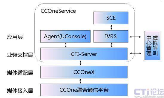應(yīng)用支撐CCOneService主要由CTI-Server、IVRS、UConsole和SCE組成。