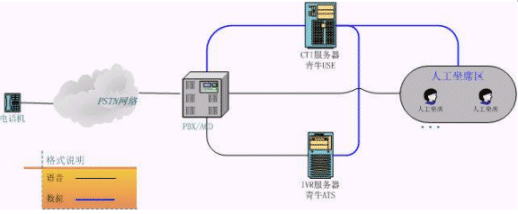 上圖是客服中心較常見(jiàn)的結(jié)構(gòu)圖,相當(dāng)于將初級(jí)客服的CT-Server服務(wù)器一分為三。原來(lái)的語(yǔ)音板卡由現(xiàn)在真正的PBX替代,青牛USE和青牛ATS則是從CT-Server軟件包中獨(dú)立出來(lái),強(qiáng)化各自的核心功能,運(yùn)行在兩臺(tái)單獨(dú)的服務(wù)器上(IVR服務(wù)器還是需要語(yǔ)音板卡來(lái)處理話路,但語(yǔ)音板卡已經(jīng)不負(fù)責(zé)PBX的交換功能了)。這種類型的客服中心可以給客戶更大規(guī)模的、更穩(wěn)定的服務(wù),并且撥入電話的客戶感覺(jué)不到系統(tǒng)的變化。