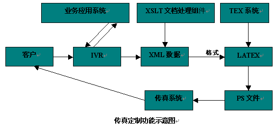 用戶通過IVR與業(yè)務(wù)應(yīng)用系統(tǒng)交互,獲得所需的傳真數(shù)據(jù),這些傳真數(shù)據(jù)在系統(tǒng)中以XML數(shù)據(jù)的格式存在,系統(tǒng)然后調(diào)用XSLT(英文縮寫,XSLT是語言,專門處理XML數(shù)據(jù),通過一段XSLT程序可以將XML數(shù)據(jù)轉(zhuǎn)換成其他的形式的文檔,如HTML,LATEX文檔,從而用來顯示XML數(shù)據(jù)給人們閱讀)文檔處理組件對(duì)XML數(shù)據(jù)處理,處理結(jié)果是LATEX(LATEX是TEX系統(tǒng)增加了一些宏指令的增強(qiáng),TEX系統(tǒng)是一個(gè)計(jì)算機(jī)排版系統(tǒng),