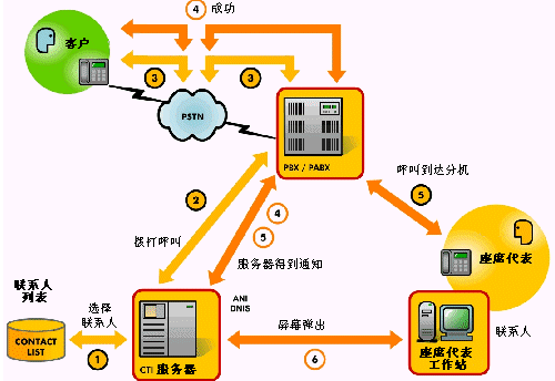 在“呼出”交互中,一個(gè)標(biāo)準(zhǔn)的客戶服務(wù)系統(tǒng)應(yīng)該預(yù)裝有一個(gè)用于執(zhí)行的聯(lián)系人列表,然后自動(dòng)生成呼叫并且將呼叫分配至可用的座席代表,如下圖所示: