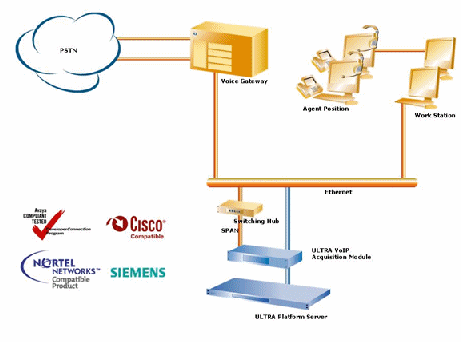 ULTRA平臺(tái)的VoIP錄音方案可真正實(shí)現(xiàn)純軟件解決方案,可由客戶自行配置符合要求的錄音服務(wù)器,安裝ULTRA平臺(tái)的軟件即可。另外,對(duì)于不能提供具備SPAN功能的網(wǎng)絡(luò)使用環(huán)境,ULTRA平臺(tái)也可提供相應(yīng)的模塊產(chǎn)品(ULTRA