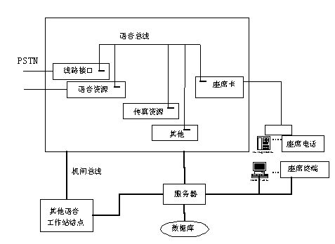 所謂的PC方式就是計(jì)算機(jī)+語音板卡,即在微機(jī)平臺上集成各種功能的資源處理卡,完成通信接口、語音處理、傳真處理、座席轉(zhuǎn)接等功能,再結(jié)合外部的計(jì)算機(jī)網(wǎng)絡(luò)實(shí)現(xiàn)各種應(yīng)用系統(tǒng)的需求。整個系統(tǒng)是一個Client/Server結(jié)構(gòu)的微機(jī)網(wǎng)絡(luò)。