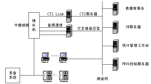 ACD方式即前置交換機(jī)+語音服務(wù)器,即在專用交換機(jī)+ACD(自動話務(wù)分配)的基礎(chǔ)上擴(kuò)展功能,用CTI技術(shù)實(shí)現(xiàn)通信和計(jì)算機(jī)的功能結(jié)合,并配以必要的語音和數(shù)據(jù)庫系統(tǒng)。
