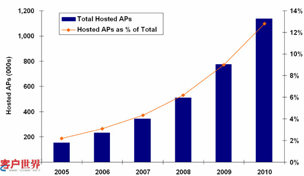 根據(jù)datamonitor在2006年的分析,自2005年起,全球呼叫中心托管的總數(shù)約二十萬個座席,占全球呼叫中心的總座席數(shù)得2%,到2008年成長到約五十萬個座席,占總量的6%左右,在2010年時更會成長到超過一百萬個座席占總數(shù)的10%左右。所以整個托管市場來說將會持續(xù)不斷的成長(見圖二)。