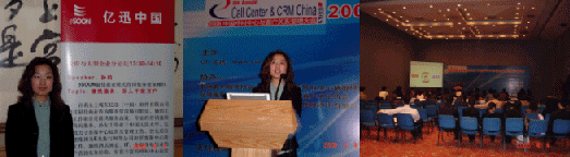 一年一度的中國呼叫中心與客戶關(guān)系管理大會于2006年4月3日在北京國際會議中心隆重開幕,并與4月5日圓滿閉幕。今年大會主題為:新時期的呼叫中心及CRM,成就與挑戰(zhàn)。此次活動吸引了與呼叫中心相關(guān)的各界人士的光臨,共計1000多人與會,活動連續(xù)三天。億迅(中國)軟件有限公司(eSOON)作為呼叫中心及CRM業(yè)優(yōu)秀的開發(fā)商和集成商,在本次大會上以特別贊助商的身份閃亮登場,給大家留下了深刻的印象,并為大家?guī)砗艚兄行募癈RM領(lǐng)域最新的趨勢分析及最佳的解決方案。