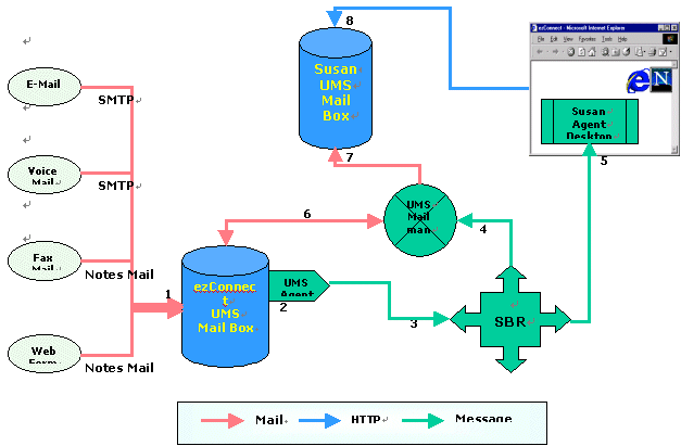 各類(lèi)外部語(yǔ)音、郵件、WEB、傳真等信息進(jìn)入呼叫中心會(huì)以相應(yīng)的格式直接被放入ezConnect統(tǒng)一郵件服務(wù)器(1),消息經(jīng)過(guò)UMS Agent 模塊被提取出信息主題和關(guān)鍵字(2),這些主題和關(guān)鍵字被送入基于技能的路由選擇模塊SBR(3),由SBR進(jìn)行分析,選擇出最合適服務(wù)的座席(例如是Susan);之后SBR通知郵件轉(zhuǎn)發(fā)器(4)去ezConnect統(tǒng)一郵件服務(wù)器中取相應(yīng)的郵件(6),將郵件放入最佳座席(Susan)的UMS信箱中(7)(8),與此同時(shí)座席Susan的界面上顯示出她有一封新的郵件(5)。至此,完成了座席Susan 接收UMS信件的全過(guò)程。