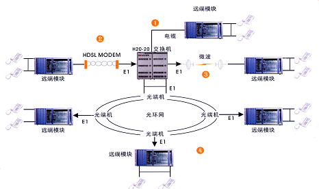 遠(yuǎn)端模塊通過標(biāo)準(zhǔn) 2M ( E1 )接口與交換機(jī)連接。該接口不受傳輸距離和傳輸設(shè)備的限制。常用的傳輸設(shè)備有 SDH 、 PDH 光端機(jī)(光纜),數(shù)字微波、數(shù)字?jǐn)U頻, HDSL 調(diào)制解調(diào)器(雙絞線)等。