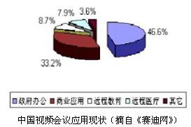 視頻會(huì)議在我國(guó)的應(yīng)用現(xiàn)狀如下圖所示。政府辦公占全部市場(chǎng)份額的46.6%。為了改善運(yùn)營(yíng)模式、提高工作效率,電信、金融、鐵路、電力等行業(yè)也在大力發(fā)展視頻會(huì)議系統(tǒng),占據(jù)了33.2%的市場(chǎng)份額。與以上領(lǐng)域相比,我國(guó)的遠(yuǎn)程教育和遠(yuǎn)程醫(yī)療尚處于發(fā)展初期,所占份額分別是8.7%和7.9%。這反映視頻會(huì)議系統(tǒng)在遠(yuǎn)程教育、遠(yuǎn)程醫(yī)療等方面建設(shè)力度還不夠大。不過(guò),據(jù)我們研究表明,這兩個(gè)領(lǐng)域的應(yīng)用近年來(lái)呈現(xiàn)出蓬勃發(fā)展的勢(shì)頭,相信很快就會(huì)有良好的表現(xiàn)。