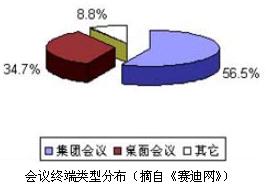 視頻會(huì)議的功能主要包括音視頻功能和數(shù)據(jù)共享功能。數(shù)據(jù)共享是指通過(guò)視頻會(huì)議系統(tǒng)使身處異地的合作者相互了解情況并共享數(shù)據(jù)應(yīng)用(例如電子白板、共享文檔、協(xié)同瀏覽等)。根據(jù)對(duì)視頻會(huì)議功能側(cè)重點(diǎn)的不同,視頻會(huì)議系統(tǒng)分為視頻會(huì)議終端(也稱集團(tuán)會(huì)議終端)和網(wǎng)絡(luò)會(huì)議終端(也稱桌面會(huì)議終端)。視頻會(huì)議終端經(jīng)過(guò)專門設(shè)計(jì),功能完善,安裝在特定的會(huì)議室中,不能隨意移動(dòng),能夠?qū)崿F(xiàn)復(fù)雜的視頻會(huì)議;網(wǎng)絡(luò)會(huì)議終端一般是經(jīng)過(guò)專門設(shè)計(jì)的個(gè)人計(jì)算機(jī),它既可以作為普通計(jì)算機(jī)使用,又可以作為會(huì)議終端,是實(shí)現(xiàn)會(huì)議、數(shù)據(jù)等綜合應(yīng)用的平臺(tái)。如下圖所示,集團(tuán)會(huì)議終端所占份額為56.5%,桌面會(huì)議終端為34.7%。網(wǎng)絡(luò)會(huì)議終端盡管發(fā)展時(shí)間不長(zhǎng),但由于其較好地集成了會(huì)議、數(shù)據(jù)等應(yīng)用,其市場(chǎng)份額也頗為可觀,而且近年來(lái)增長(zhǎng)十分迅速。