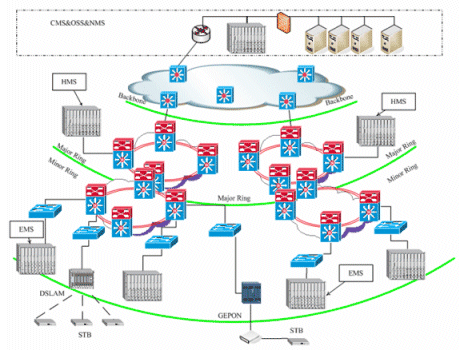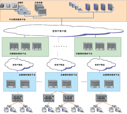奔流(RollingStream)系統(tǒng)可以支持百萬(wàn)級(jí)別的用戶規(guī)模,支持3級(jí)和多級(jí)部署架構(gòu)。包括中心節(jié)點(diǎn)(CMS)、區(qū)域匯聚節(jié)點(diǎn)(HMS)以及邊緣服務(wù)節(jié)點(diǎn)(EMS)。奔流(RollingStream)系統(tǒng)對(duì)于寬帶IP網(wǎng)絡(luò)的容忍度是很高的,可以支持各種網(wǎng)絡(luò)承載形式,也可支持各種接入方式。如LAN接入、DSLAM接入、GEPON接入。對(duì)于IPTV系統(tǒng),可建設(shè)專(zhuān)網(wǎng),CMS和HMS、EMS直接相連,也可以旁掛在城域網(wǎng)上。另外,無(wú)論P(yáng)PPoE還是DHCP上網(wǎng)方式都可以支持。