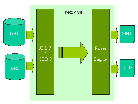 DB2XML中通過JDBC或JDBC-ODBC橋接各種現(xiàn)存的數(shù)據(jù)庫,訪問數(shù)據(jù)庫中的表;通過XML parser構(gòu)造出代表數(shù)據(jù)庫內(nèi)容的XML文件。DTD文件描述了從數(shù)據(jù)庫中的表到XML文件的對應(yīng)關(guān)系。上圖描述了DB2XML的輸入輸出關(guān)系。事實上DB2XML是按照以下步驟完成轉(zhuǎn)化工作的:
