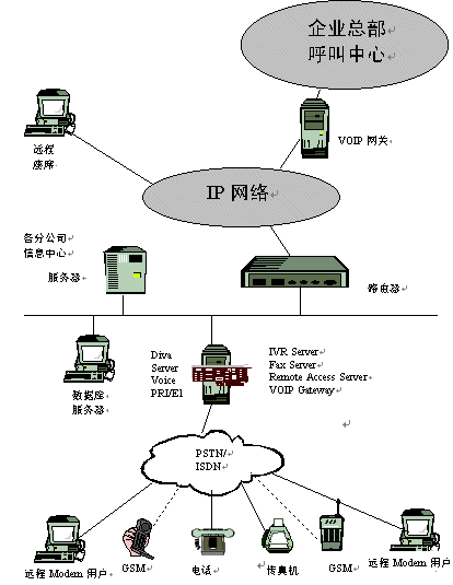隨著信息技術(shù)的發(fā)展,企業(yè)對(duì)通訊的需求越來(lái)越多,并越來(lái)越呈現(xiàn)多樣性,有語(yǔ)音通訊,傳真通訊,數(shù)據(jù)通訊等。我們拿銀行作為一個(gè)例子來(lái)分析,目前我國(guó)大多數(shù)大型商業(yè)銀行都在各個(gè)市(甚至縣)建有一個(gè)IVR交互式語(yǔ)音應(yīng)答系統(tǒng)以滿足其客戶的語(yǔ)音查詢需求;同時(shí),系統(tǒng)也要具備傳真通訊功能,以滿足某些大客戶需要傳真回復(fù)確認(rèn)的需求;目前,各個(gè)商業(yè)銀行也建立了自己的企業(yè)銀行平臺(tái),所以中心也需構(gòu)建一個(gè)接入服務(wù)器來(lái)滿足某些大客戶的遠(yuǎn)程撥號(hào)接入進(jìn)行遠(yuǎn)程交易;隨著Call center 應(yīng)用的興起,各商業(yè)銀行的省行呼叫中心需要將其各市行的語(yǔ)音接入平臺(tái)(IVR),通過(guò)VoIP 技術(shù),接入到省行的Call Center 中心,從而建立一個(gè)分布式的Call Center,以提高對(duì)其客戶服務(wù)的滿意度 。