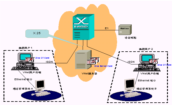 圖中集團用戶1與集團用戶2內(nèi)部使用了配置Eicon 公司Diva CT Card的Vnet系統(tǒng)用戶終端,同時接入ISDN設(shè)備與EWSD交換機連接,信號通過EWSD交換機響應給配置Eicon