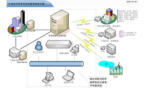 如拓樸圖所標,寧波市政府、寧波水利局與奉化市三防辦均采用了加拿大Eicon 公司與拓敏聯合推出的傳真服務器系統,可進行針對需求的智能設定傳真發(fā)送。