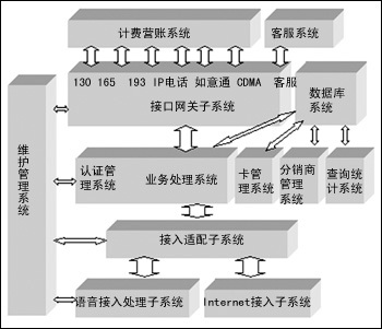 綜合付費(fèi)平臺(tái)的軟件邏輯結(jié)構(gòu)分為語(yǔ)音接入處理子系統(tǒng)、Internet 接入子系統(tǒng)、接入適配網(wǎng)關(guān)子系統(tǒng)、認(rèn)證管理子系統(tǒng)、業(yè)務(wù)處理系統(tǒng)、卡管理系統(tǒng)、分銷商管理系統(tǒng)、查詢統(tǒng)計(jì)系統(tǒng)、數(shù)據(jù)庫(kù)系統(tǒng)、接口網(wǎng)關(guān)子系統(tǒng)和維護(hù)管理子系統(tǒng)。