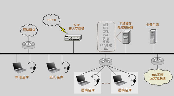 在本次客戶(hù)服務(wù)中心系統(tǒng)升級(jí)中,我們采用了更加先進(jìn)的第四代呼叫中心系統(tǒng)作為客服系統(tǒng)的平臺(tái)?梢詫(shí)現(xiàn)的客戶(hù)聯(lián)絡(luò)方式已經(jīng)不僅僅局限于傳統(tǒng)的語(yǔ)音和傳真的呼叫形式,網(wǎng)絡(luò)電話、網(wǎng)絡(luò)傳真、Email、短消息、即時(shí)消息、互聯(lián)網(wǎng)應(yīng)用等都是與客戶(hù)聯(lián)絡(luò)的重要方式,涉及到的媒體載體也不僅是PSTN,還有基于VoIP技術(shù)的現(xiàn)代網(wǎng)絡(luò)、無(wú)線網(wǎng)絡(luò)等;也就是說(shuō)第四代呼叫中心系統(tǒng)是一個(gè)融合網(wǎng)絡(luò)、語(yǔ)音、數(shù)據(jù)庫(kù)、視頻和安全技術(shù)的綜合信息服務(wù)平臺(tái)。系統(tǒng)結(jié)構(gòu)圖如下: