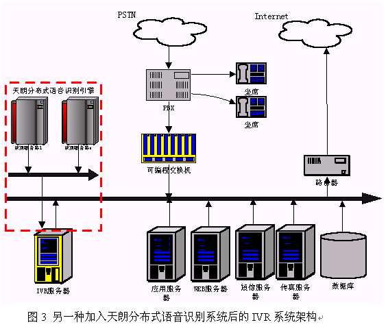 隨著語音識別的實用化進(jìn)程加快,人們越來越認(rèn)識到采用語音識別技術(shù)有利于極大的提高傳統(tǒng)按鍵方式IVR界面的友好性,提高服務(wù)的質(zhì)量。另外,采用語音識別技術(shù)可以把以前不可能實現(xiàn)的事情變得可行。因此,目前IVR行業(yè)越來越多的人認(rèn)識到語音識別技術(shù)的重要性,一些先行者已把語音識別技術(shù)集成到他們的系統(tǒng)中。那么,一個IVR廠商如何把天朗分布式語音識別系統(tǒng)集成到他們的IVR中呢?
