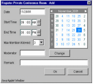 TeleConference系統(tǒng)內(nèi)的任一個(gè)分機(jī),都可以利用瀏覽器(Internet Browser)來預(yù)約會(huì)議時(shí)間,而參加會(huì)議的人可以在會(huì)議開始時(shí),自動(dòng)打電話進(jìn)系統(tǒng)參加會(huì)議就像加入“聊天室“一樣簡(jiǎn)單。
