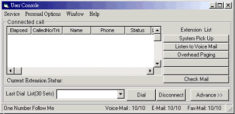 TelePCX 提供屏幕電話使用界面(User Console),提供每一個分機(jī)使用者一個GUI的計(jì)算機(jī)操控畫面,無論電話進(jìn)線時的聲響提示,Caller ID實(shí)時顯示以及完整的電話控制,從應(yīng)答,撥號,轉(zhuǎn)接乃至各種復(fù)雜的功能設(shè)置如:電話會議(多方通話)、多線電話跳接、通話中聯(lián)機(jī)實(shí)時錄音……等,均可經(jīng)由點(diǎn)按鼠標(biāo),由計(jì)算機(jī)上的畫面做實(shí)時的控制,不必記憶復(fù)雜的操作步驟或查詢使用手冊,方便簡易。