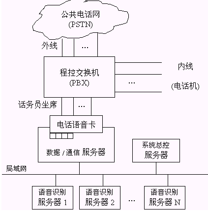 這是一個易擴展的系統(tǒng)結(jié)構(gòu)。當(dāng)話務(wù)員坐席規(guī)模較大時,系統(tǒng)可增加多臺識別服務(wù)器并立即生效而不需進行特殊的配置,當(dāng)話務(wù)員坐席規(guī)模較小時,上述各個"邏輯"的軟件服務(wù)器可運行在同一臺"物理"的機器上,從而在保證整體系統(tǒng)性能的前提下,降低硬件的成本。