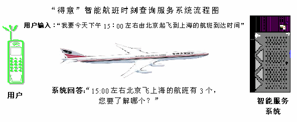 使用"得意"智能航班時刻查詢服務(wù)系統(tǒng),用戶可以通過短信/WAP/互聯(lián)網(wǎng)以自然語言的方式與服務(wù)系統(tǒng)進(jìn)行互動,方便地查詢各個航班的時刻,以及相關(guān)的信息。當(dāng)用戶在對話過程中遇到困難時,系統(tǒng)還會主動引導(dǎo)用戶獲取想要的信息,能為乘客和交通機構(gòu)提供很好的服務(wù)手段,實現(xiàn)真正的"智能"。