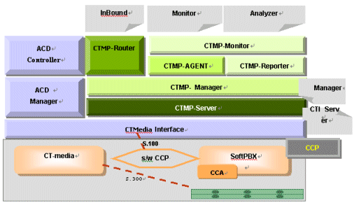 以CCP為基礎(chǔ)的CTMP Suite系統(tǒng)軟件不僅為顧客聯(lián)絡(luò)中心準(zhǔn)備了多樣化的、便利性的實(shí)用功能,而且還提供整合性管理接口與簡(jiǎn)易方便的維護(hù)服務(wù),此外,該系統(tǒng)軟件還能根據(jù)顧客的要求,在同一平臺(tái)上兼容運(yùn)行IVR、VMS(語(yǔ)音郵件系統(tǒng)-Voice Mail System)、VRS(語(yǔ)音記錄系統(tǒng)-Voice Recording System)等多樣化的解決方案程序。系統(tǒng)結(jié)構(gòu)圖如下: