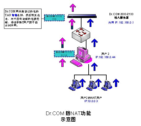 共享合法用戶的身份的NAT用戶,由于他們發(fā)出的數(shù)據(jù)包是沒有經(jīng)過封裝的,雖然經(jīng)過合法用戶的電腦實(shí)現(xiàn)了地址轉(zhuǎn)換,但Dr.COM的防代理客戶端不會(huì)對(duì)這些NAT用戶的數(shù)據(jù)包進(jìn)行封裝,所以這些數(shù)據(jù)包就在網(wǎng)關(guān)被過濾掉,代理用戶就不能正常上網(wǎng)。